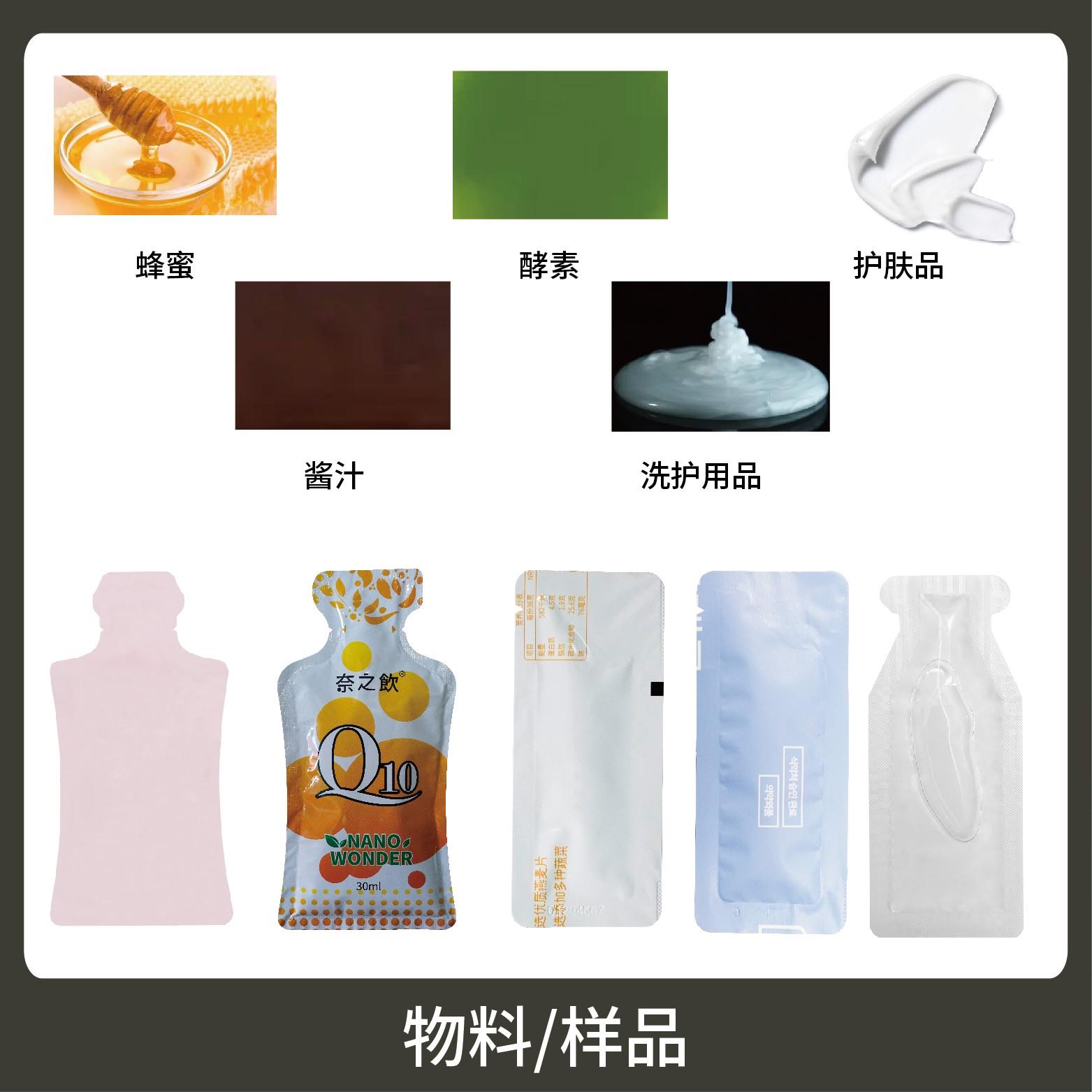 適用于各行業(yè)中酵素、果汁、漱口水、洗護(hù)用品、染發(fā)劑、化妝品小樣等醬料、液體物品的雙列異形袋計(jì)量包裝。